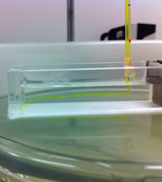 I used these small experimental chambers to test how dragonfly nymphs would respond to waterborne chemical cues. I've just introduced fluorescein dye to determine flow dynamics.