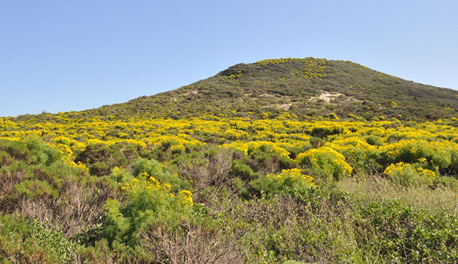 Spring in the coastal area of the Santa Monica Mountains. The bright yellow of Coreopsis gigantea is electrifying.